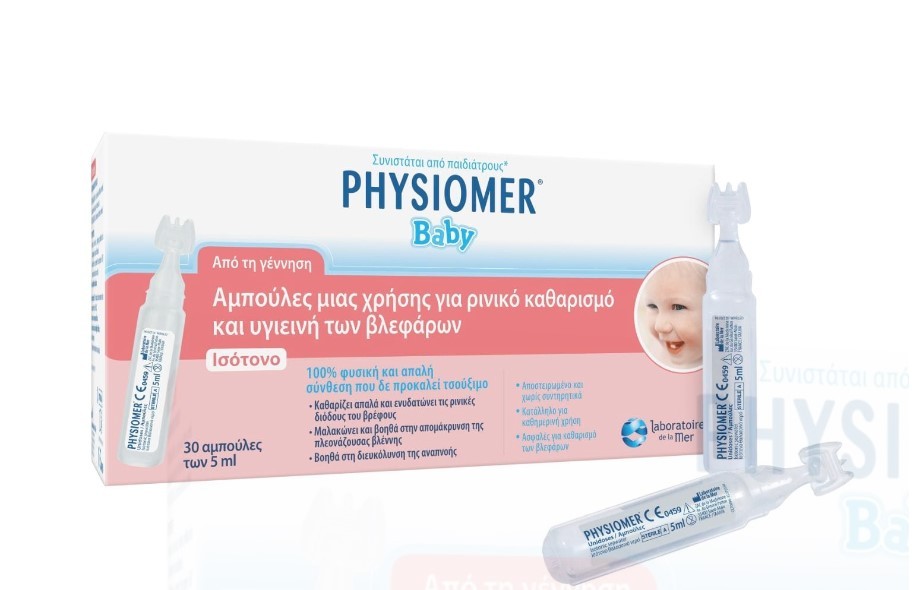 PHYSIOMER® Baby single doses are filled with 100% seawater, for natural release of your baby’s nasal obstruction caused by a cold, a rhinitis or a rhinopharyngitis.