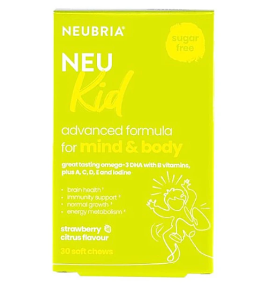 Neubria NEU Kid is a specialized nutritional supplement for the mind and body, high in omega-3 (300 mg per serving), vitamins A, B, C & D and iodine.