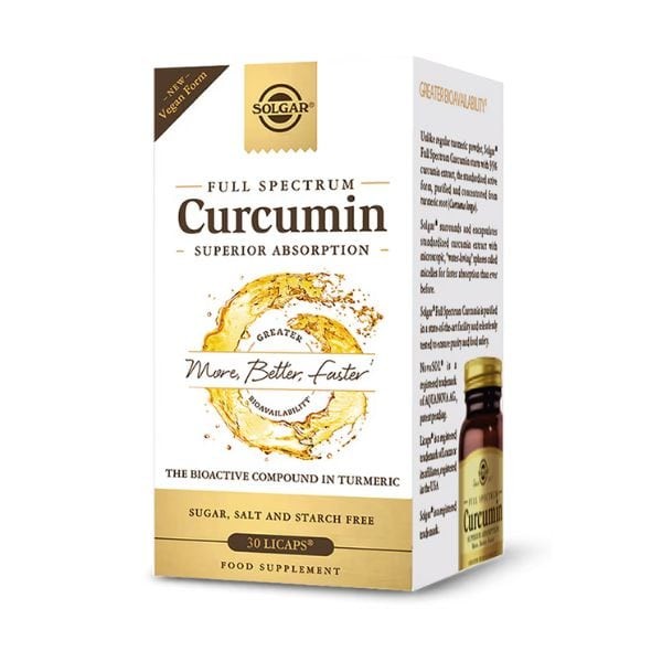 Solgar Full Spectrum Curcumin is the most bioavailable form of curcuma with 185 times better absorption in the body compared to other forms of curcuma. The active ingredients in curcuma include beneficial flavonoids, which are plant-based antioxidants that help manage free radicals in the body. Unlike traditional curcuma, this form of curcumin is easily absorbed and can benefit the entire body, not just the digestive system.
