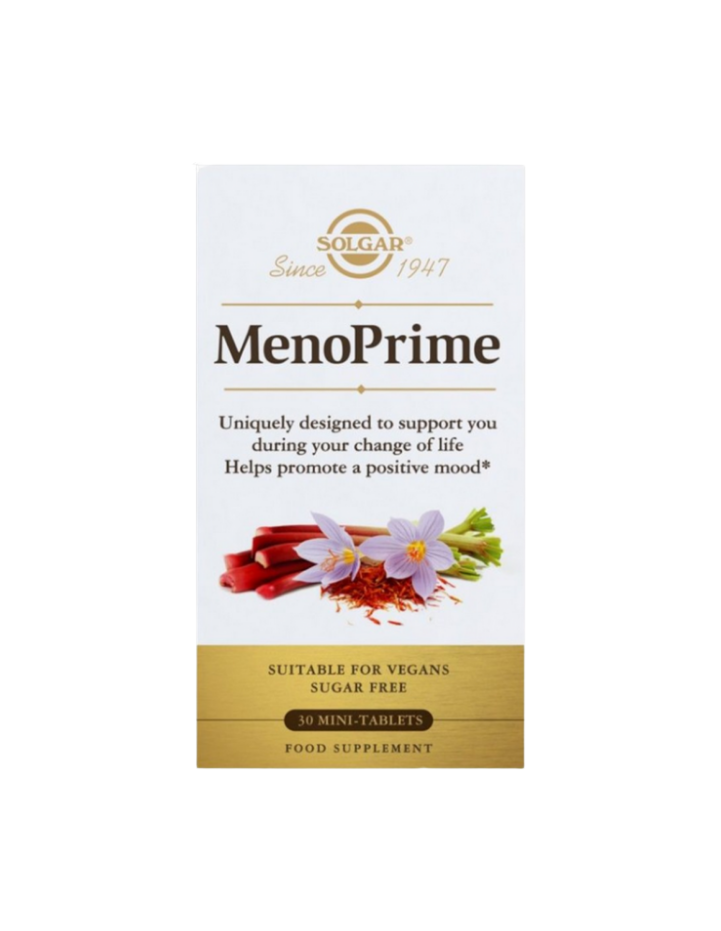 Solgar MenoPrime is a unique blend of two clinically studied botanical extracts, Crocus (affron®) and Siberian Rhubarb ERr-731®, offering non-hormonal, plant-based support for managing symptoms associated with menopause and enhancing mood.