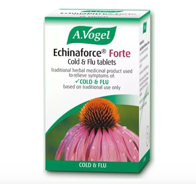 A. Vogel Echinaforce Forte is a dietary supplement containing tablets with 100% organic fresh echinacea extract (contains parts of the whole plant) to strengthen the body and protect against colds.