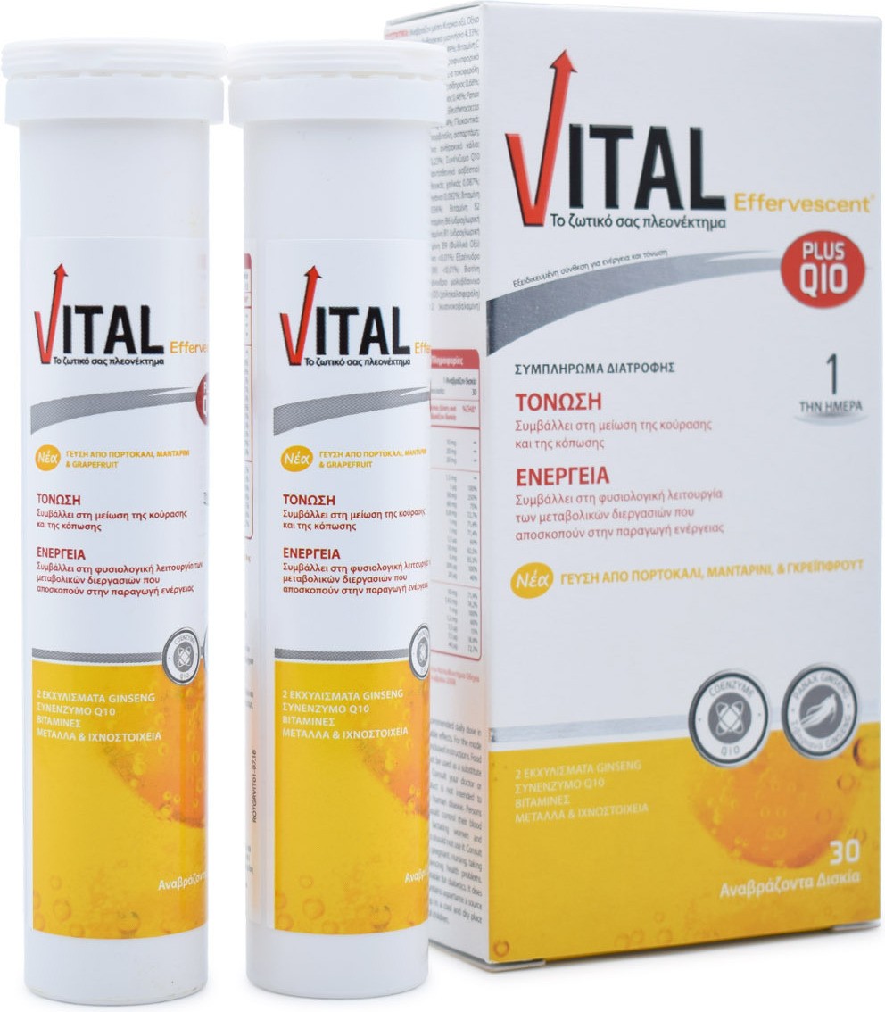 The new VITAL EFFERVESCENT plus Q10 is the only dietary supplement with 12 vitamins, 11 minerals, 2 ginseng extracts and coenzyme Q10 in effervescent tablets. Thanks to the wonderful taste of orange, tangerine and grapefruit, it is drunk easily at any time of the day by supplying the body with all the necessary components while providing the necessary strength and energy needed daily.